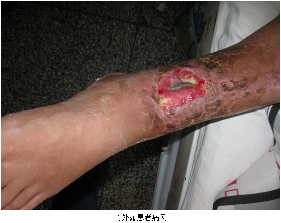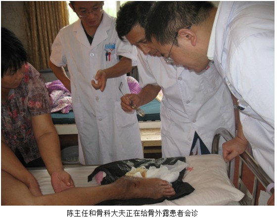 該院骨科有兩位骨外露患者已術(shù)后多日,傷口不愈合,請陳主任會診:第一例病人張某,男,半年前因車禍造成左小腿粉碎性骨折,手術(shù)后半年傷口不愈合,骨和鋼板暴露;第二例病人王某,男,右足跟部被汽車軋傷,踝骨骨折,手術(shù)后傷口不愈合96天。會診后陳全喜主任結(jié)合兩個病人進行了病情分析,接著系統(tǒng)講述了皮膚原位再生醫(yī)療技術(shù),并把治療的骨外露的病例進行了展示??剖伊淮蠓蚵犃似つw原位再生醫(yī)療技術(shù)和看到的治療病例,很是欽佩。主任李季然說:“陳主任,在您的指導(dǎo)下,讓這兩位病人應(yīng)用皮膚原位再生醫(yī)療技術(shù)治療,讓我們學(xué)習吧” 。