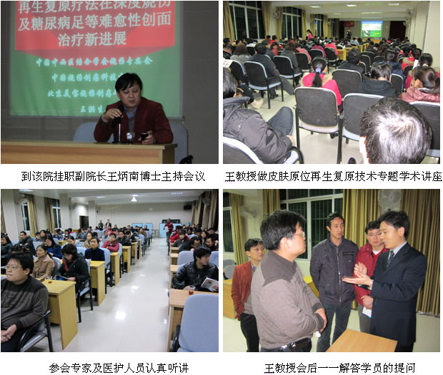 在學(xué)術(shù)講座中,王教授首先向與會(huì)醫(yī)護(hù)人員介紹了我國(guó)著名生命科學(xué)家、醫(yī)學(xué)家徐榮祥教授在人體再生復(fù)原科學(xué)領(lǐng)域取得的實(shí)驗(yàn)及臨床研究最新進(jìn)展,在2010年年底公布的“人體生命延續(xù)之謎(二)——線粒體主導(dǎo)日常生命”,破解了“精、氣、神、力”旺盛與人體啟動(dòng)了再生生命程序有關(guān),與細(xì)胞內(nèi)各主要細(xì)胞器功能的發(fā)揮有關(guān),并進(jìn)一步證實(shí)了一個(gè)生命體可以同時(shí)具有“基本生命”和“再生生命”等,接下來(lái)王教授結(jié)合了大量的臨床病例圖片,針對(duì)不同深度的燒傷創(chuàng)面及各類難愈性創(chuàng)傷、潰瘍創(chuàng)面的規(guī)范化處理方法與技巧、注意事項(xiàng)等進(jìn)行了細(xì)致地講解,著重講了再生療法在糖尿病足及其他難愈性創(chuàng)傷、創(chuàng)面中的應(yīng)用,特別介紹了該項(xiàng)技術(shù)已經(jīng)在各地醫(yī)院大量應(yīng)用于臨床,并且取得了非常好的療效,與會(huì)的醫(yī)護(hù)人員看到大量真實(shí)的臨床病例資料圖片后,都被皮膚原位再生復(fù)原技術(shù)良好的治愈效果所震撼。這次講座一直持續(xù)到晚上9時(shí)40分結(jié)束。