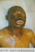 4)Ⅲ度淺型創(chuàng)面涂藥后壞死組織液化的一般規(guī)律是:35天已去除腐皮的Ⅲ度淺型創(chuàng)面發(fā)白或白色。610天創(chuàng)面出現(xiàn)顆粒狀液化物,量多層厚,持續(xù)時間較長。2535天液化物基本消失,創(chuàng)面新鮮。此時如Ⅲ度偏淺創(chuàng)面,可以繼續(xù)涂藥,觀察創(chuàng)面自行愈合情況。也可以同Ⅲ度偏深創(chuàng)面一起,行肉芽創(chuàng)面游離植皮,盡早消滅創(chuàng)面,以縮短病程和力爭減少瘢痕形成。