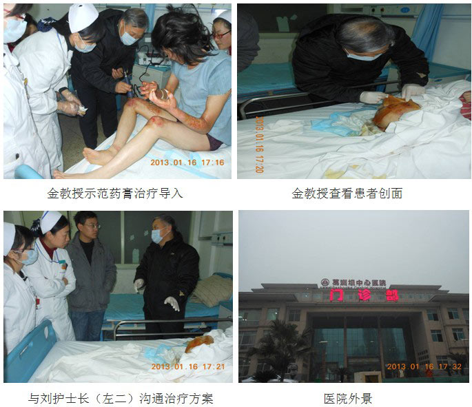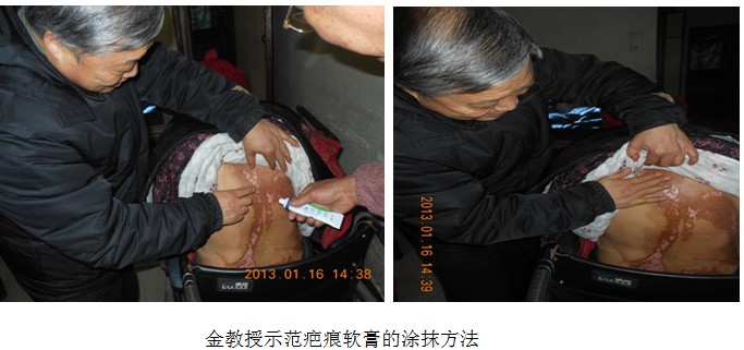 此次來到宜昌,金教授還走訪了一位背部大面積燙傷的老年患者,使用美寶疤痕軟膏快兩個月,患者中風不能行走,之前市場技術(shù)支持人員曾發(fā)過圖片并進行過電話指導(dǎo),此次金教授向家屬詳細了解了情況,并親自示范如何涂抹藥膏,如何使藥膏發(fā)揮更大作用。