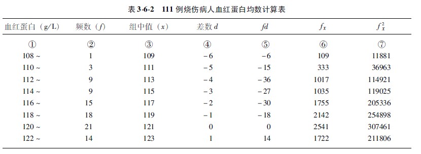示例362某醫(yī)院測(cè)檢了110例特重度燒傷病人血液血紅蛋白含量,其濃度范圍在115~150g/L之間,頻數(shù)分布情況見(jiàn)表361,利用組中值方法計(jì)算他們的平均血紅蛋白濃度。
