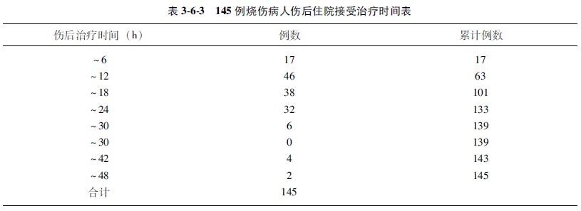 示例364表363中記錄了145例燒傷休克期病人傷后住院接受治療的時(shí)間(見(jiàn)表363),問(wèn)他們休克期住院接受治療時(shí)間的中位數(shù)是多少?