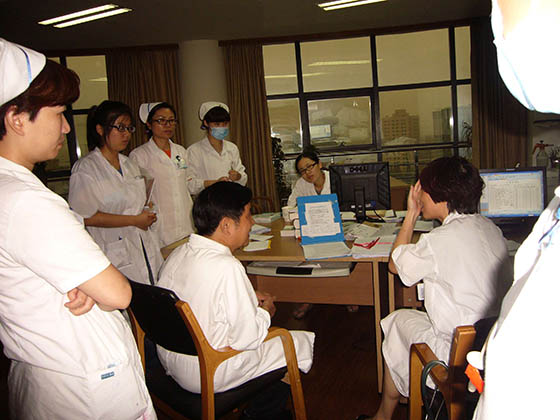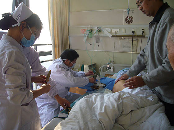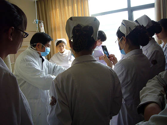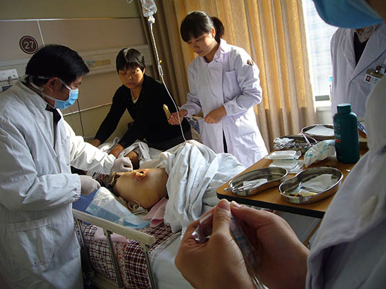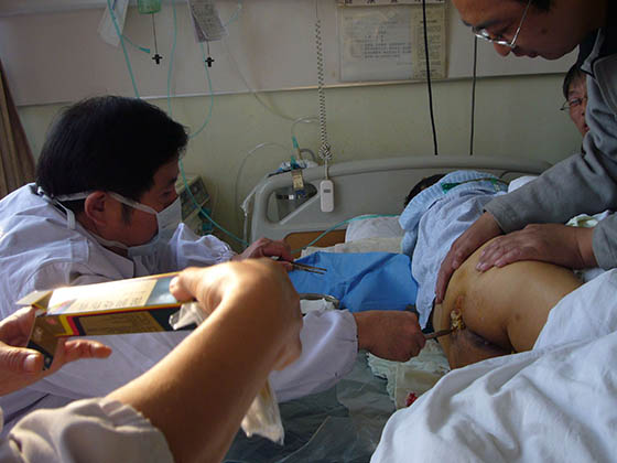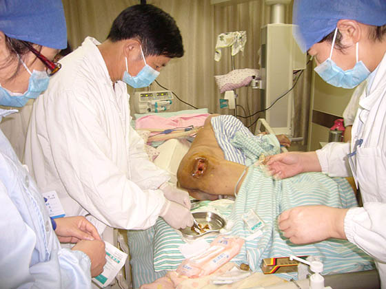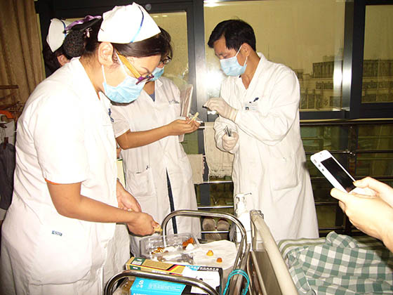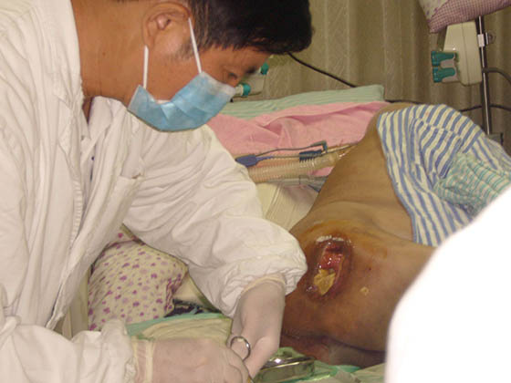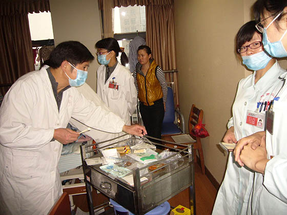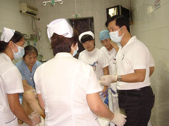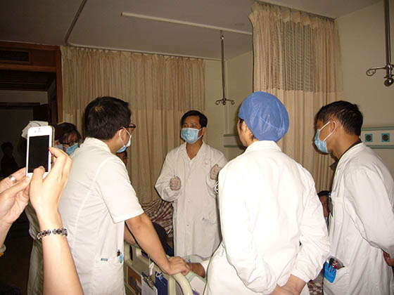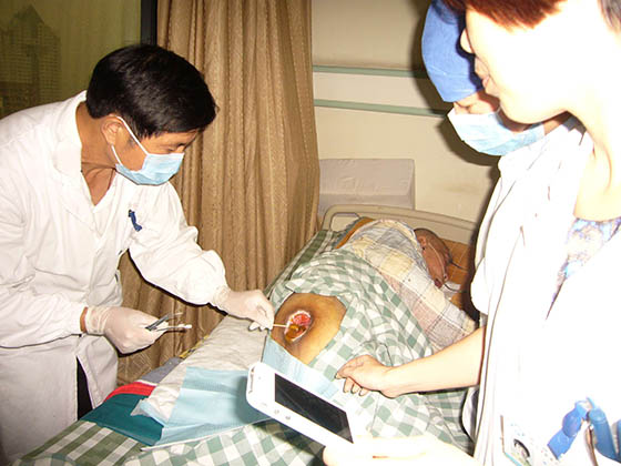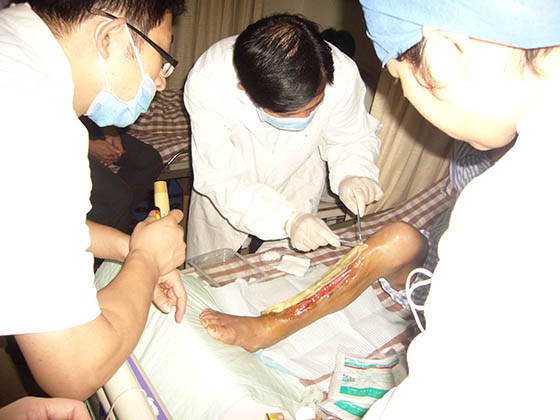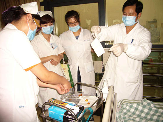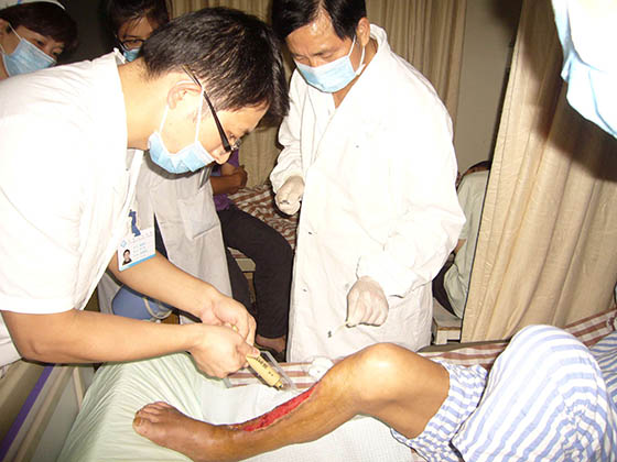 每次在各醫(yī)院培訓結束后,胡教授都不辭辛苦的應臨床邀請到醫(yī)院各科室進行會診,親自指導醫(yī)護人員為病人進行換藥治療。期間還分別前往浙江醫(yī)院等多家醫(yī)院進行了院內的科室培訓講座,并現(xiàn)場指導醫(yī)護人員為病人換藥治療。